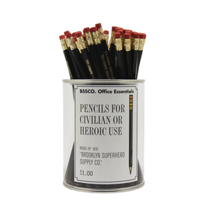 Finally, a pencil that is certified as safe for use by heroes and civilians alike. These handsome black pencils will be shipped unsharpened and with unblemished erasers, guaranteeing a clean slate for anyone who wants to write their manifesto, bildungsroman, or grocery list.
